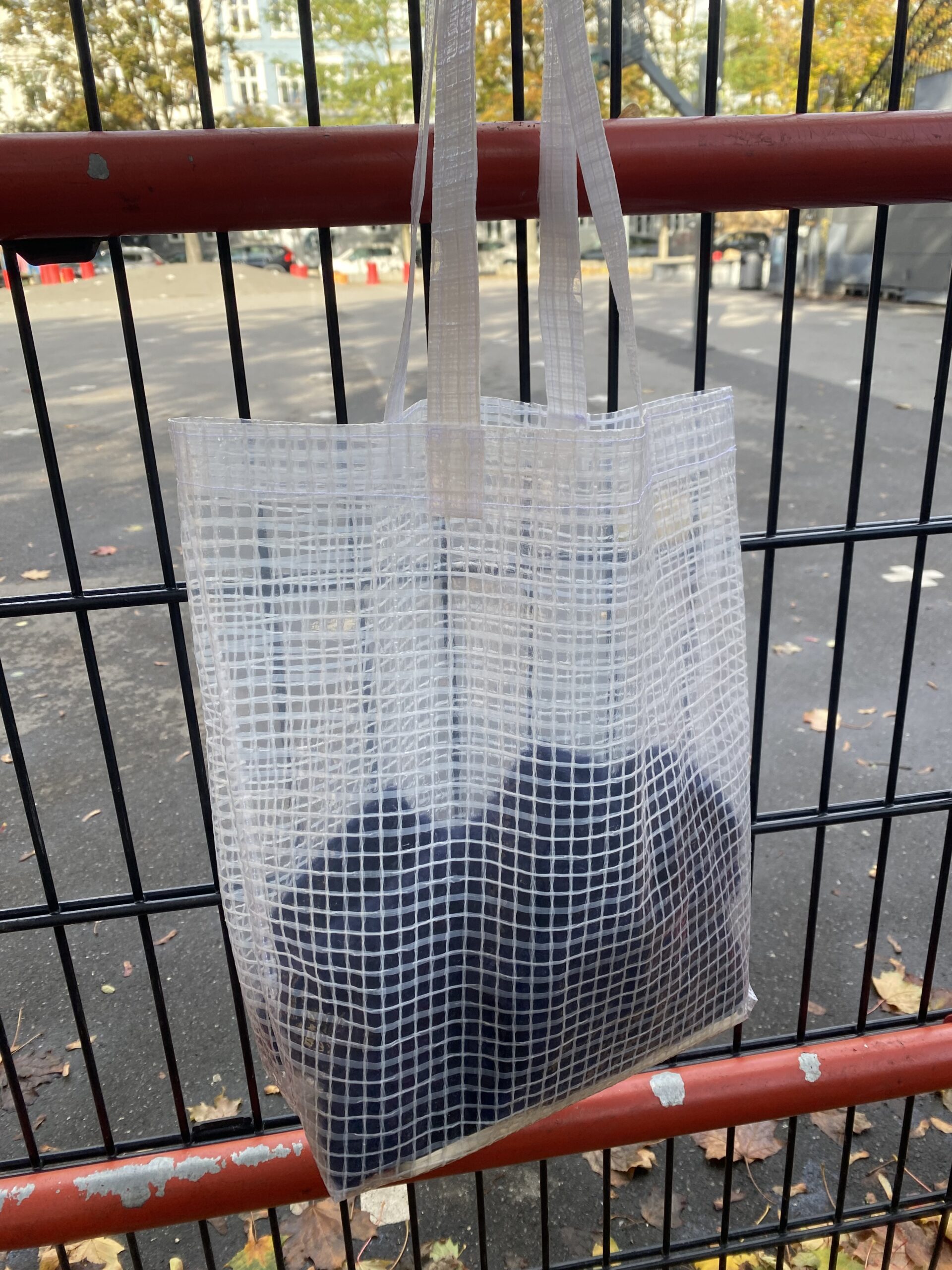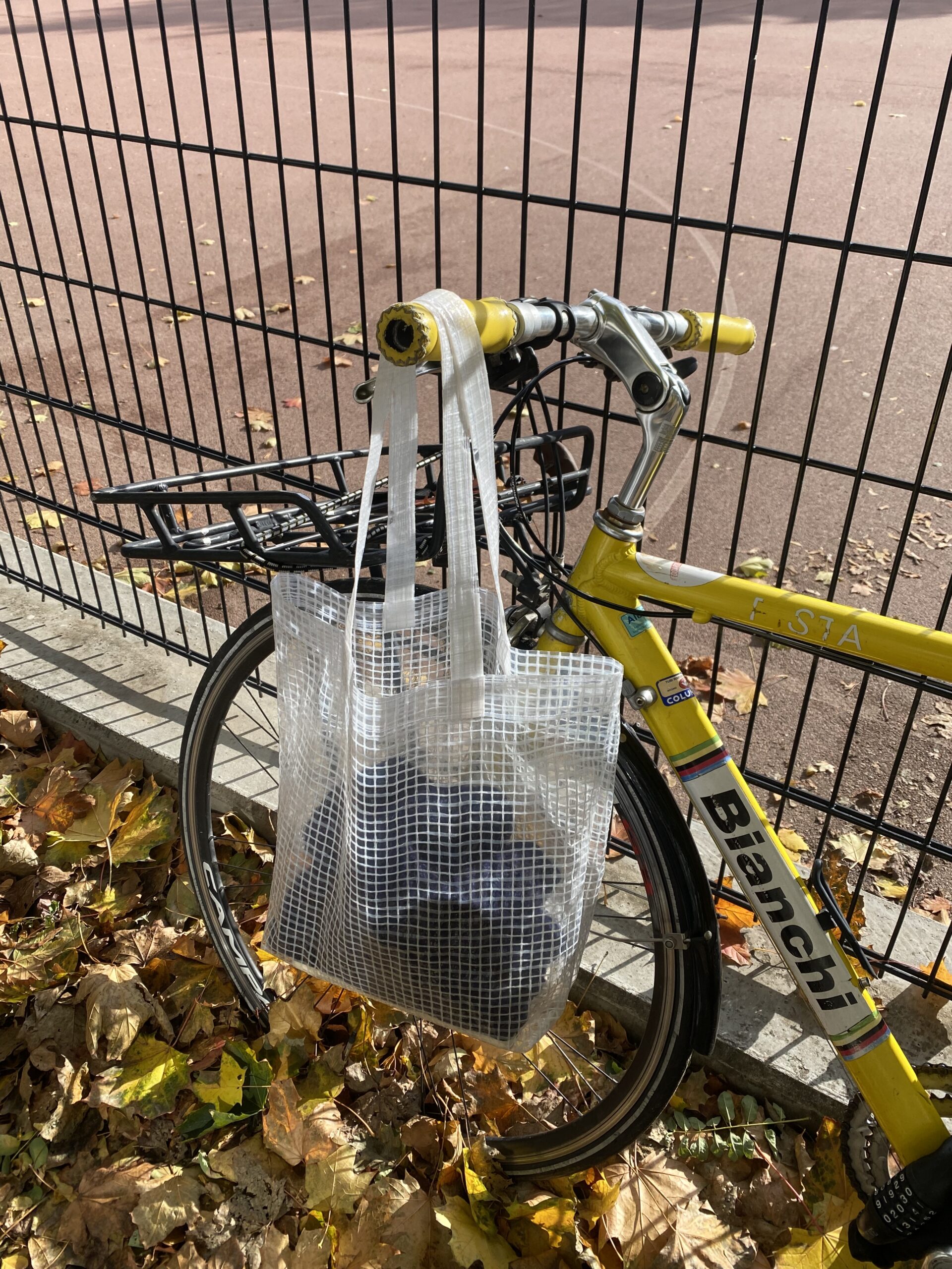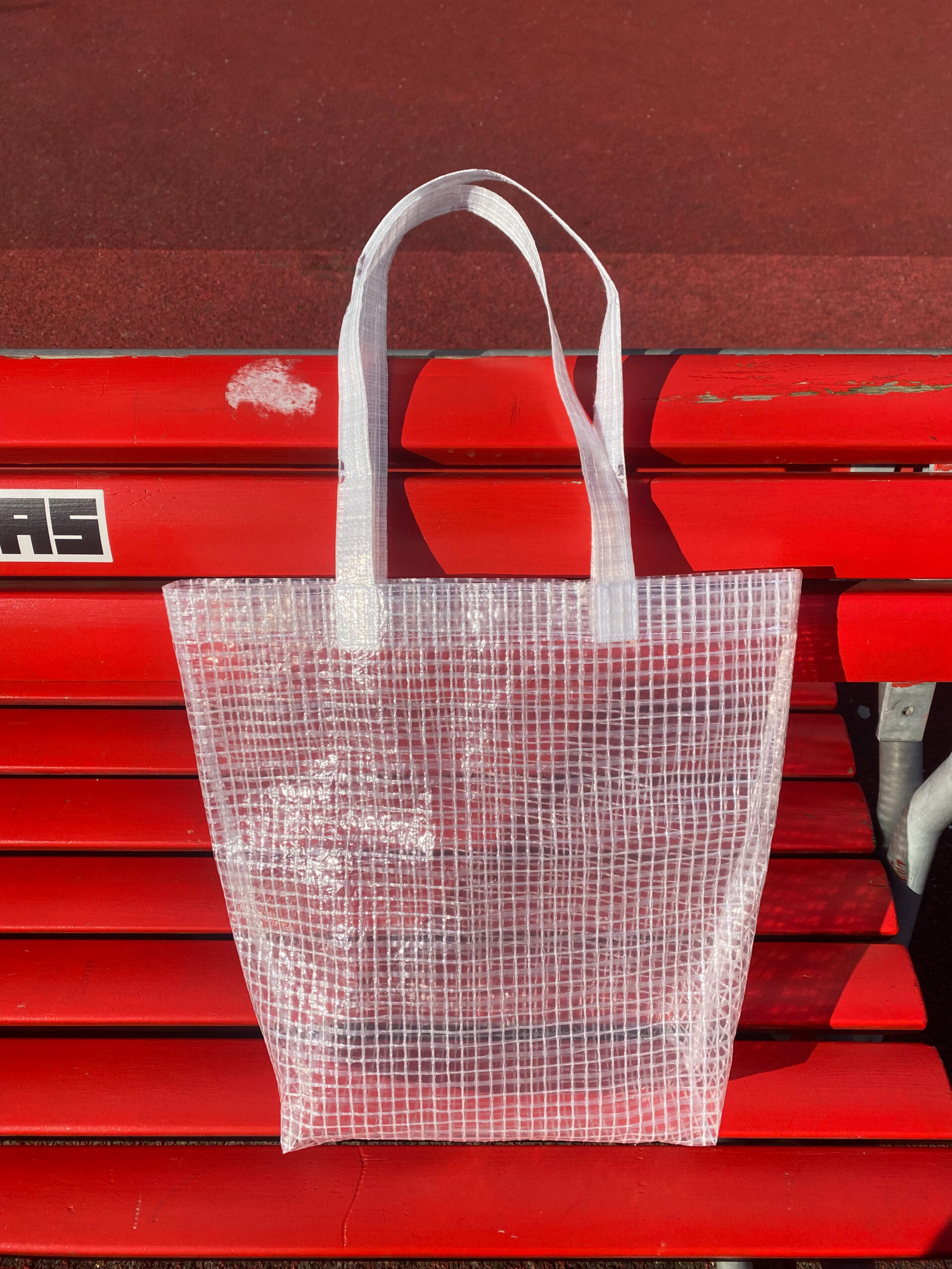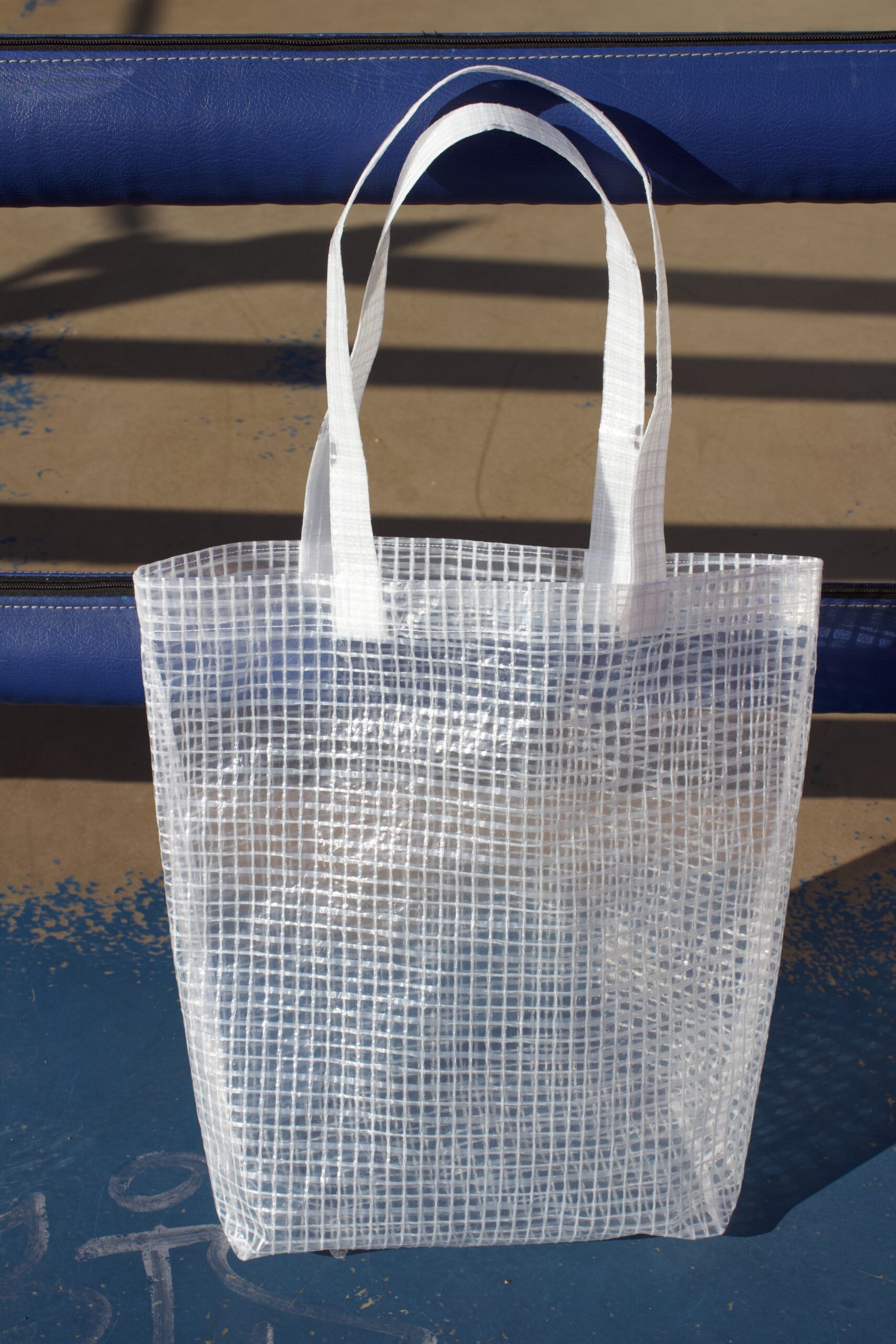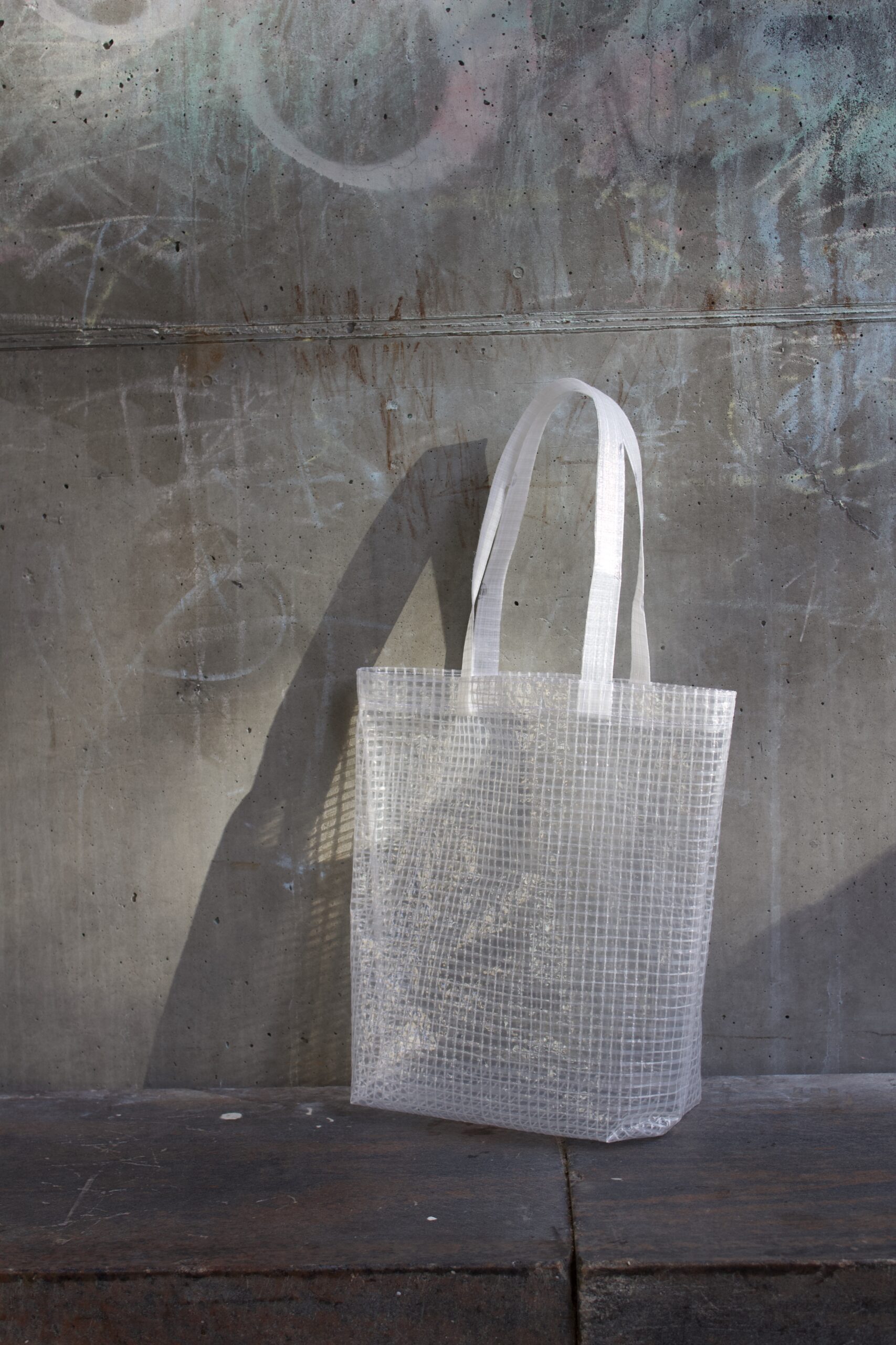 Taske lavet af overskydende stilladsplast. Alle er håndsyede, og derfor kan målene variere. Højde: 41 cm Bredde: 36 cm